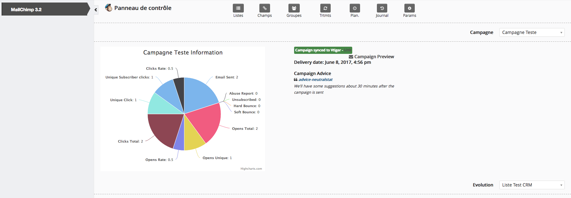 La campagne se surveille depuis DigiCRM dans le menu MailChimp
